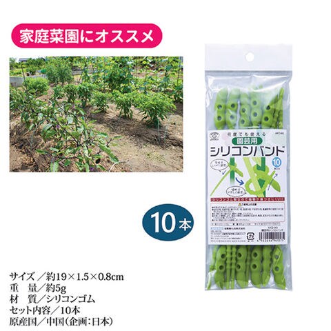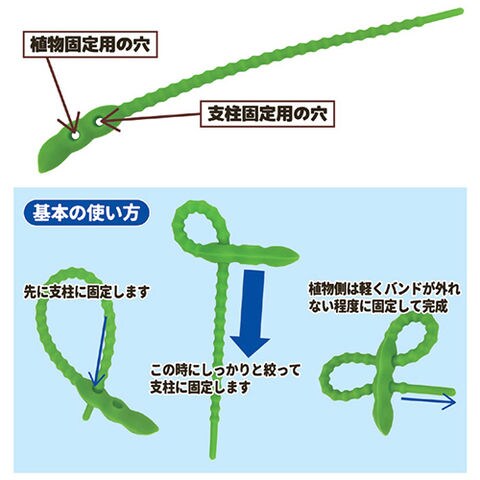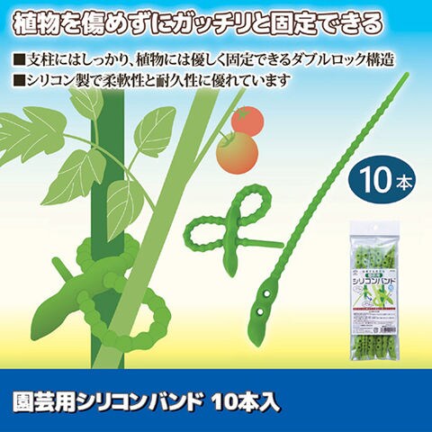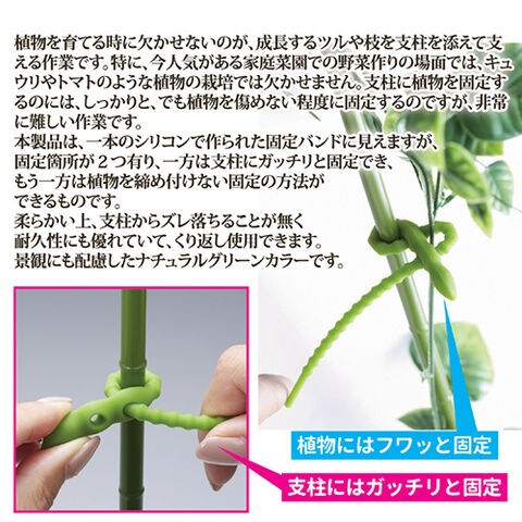 植物を育てる時に欠かせないのが、成長するツルや枝を支柱を添えて支える作業です。特に、今人気がある家庭菜園での野菜作りの場面では、キュウリやトマトのような植物の栽培では欠かせません。支柱に植物を固定するのには、しっかりと、でも植物を傷めない程度に固定するのですが、非常に難しい作業です。本製品は、一本のシリコンで作られた固定バンドに見えますが、固定箇所が2つ有り、一方は支柱にガッチリと固定でき、もう一方は植物を締め付けない固定の方法ができるものです。柔らかい上、支柱からズレ落ちることが無く耐久性にも優れていて、くり返し使用できます。景観にも配慮したナチュラルグリーンカラーです。