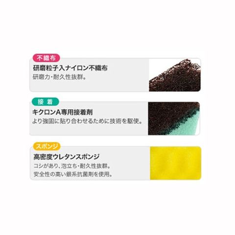 ○コシの強いスポンジと、研磨力抜群の不織布の貼り合わせスポンジたわしです。