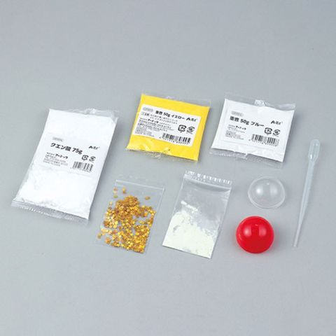 セット内容 : 重曹50gブルー×1、重曹50gイエロー×1、クエン酸75g×1、カプセルφ45mm上パーツ×1、カプセルφ45mm下パーツ(色取り混ぜ)×1、スポイト2ml×1、蓄光紛約3g×1、ホログラムグリッター星ゴールド0.5g×1