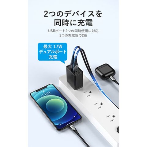 デュアルポート出力(USB-A+USB-A) : 5V DC 3.4A