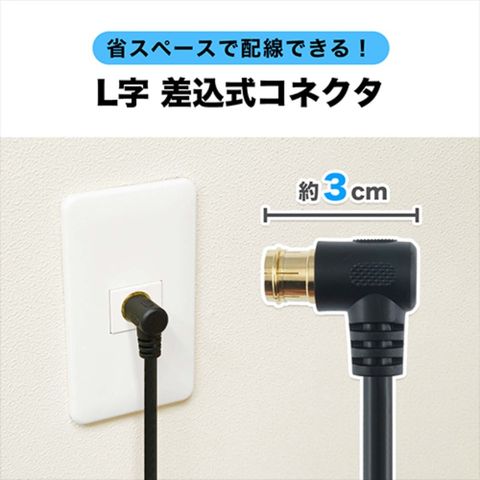 L字差込式コネクタは、狭い隙間にあるアンテナコンセントへの接続に最適です。機器にはもう一方のネジ式コネクタでしっかりと接続ができます。