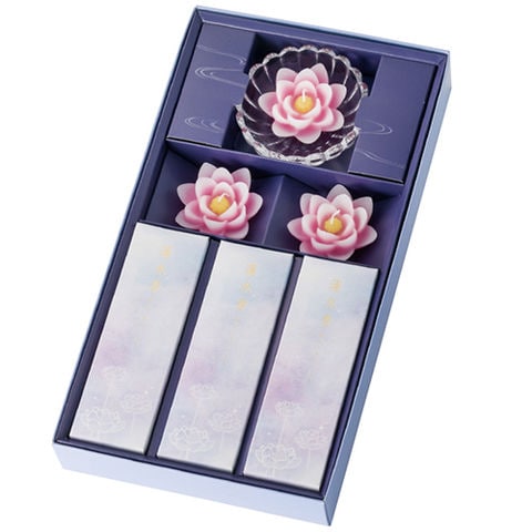 「祈る心」をお伝えしたいけれど、相手に気を使わせたくないという方から選ばれる紙箱のご進物。清らな哀しみを表現した色使いと繊細な蓮のローソクが美しく、白檀を基調としたフローラルの香りのお線香(煙少香)が、贈られる方をやさしく包み込みます。蓮のローソクは職人手作りのフローティングキャンドル。付属のガラス燭台に水を入れて浮かべると、ローソクの灯火がゆらゆらと揺れて見る方の心を癒します。