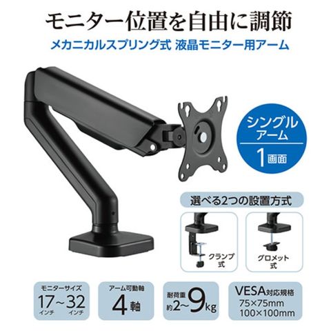 セット内容 : アーム(A)×1、アーム(B)×1、アームベース×1、VESAマウント×1、クランプ用プレート×1、クランプ×1、グロメット用プレート×1、クランプ用ネジ(A)×2、クランプ用ネジ(B)×2、VESAマウント用ネジ×1、六角レンチ/マイナスドライバー(4mm)×1、六角レンチ/プラスドライバー(5mm)×1、【モニター取り付け用部品(M4×12mm、M5×12mm)×各4、ワッシャー×4】、取扱説明書兼保証書