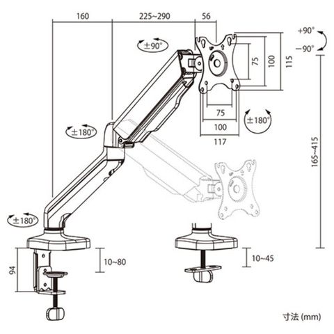 天板厚 : クランプ式10~80mm / グロメット式10~45mm
