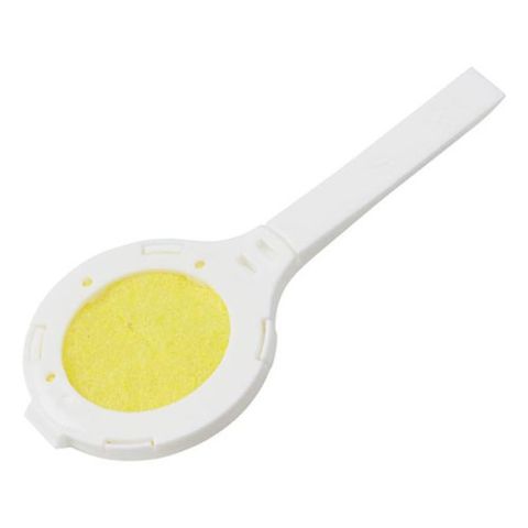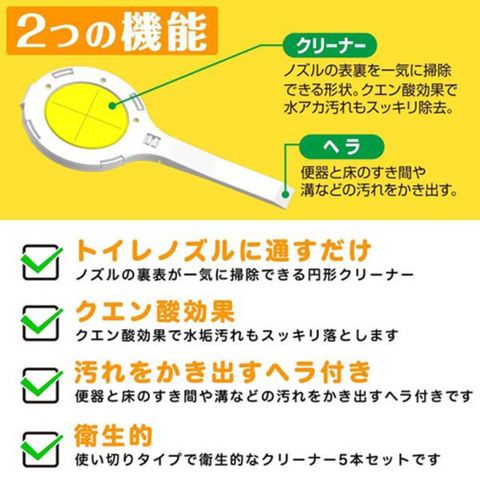 ○トイレノズルに通すだけでノズル表裏が一気に掃除できる円形クリーナーです。