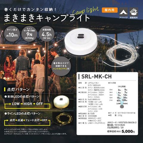 日動工業 まきまきキャンプライト 最長10mまで引き延ばし可能 まくだけ簡単収納 ホワイト SRL-MK-CH アウトドア キャンプ 【同梱不可】[▲][AS]