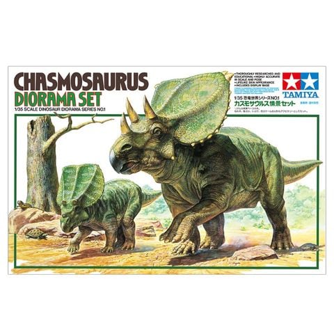 | 60101 1/35恐竜世界 カスモサウルス 情景セット 【 カスモサウルス親子の生き生きとした姿を伝えます 】 《 カスモサウルスについて 》 いまから約7500万年前から8000万年ほど前、白亜紀と呼ばれた時代の終わり頃に今の北米大陸で生きていた恐竜がカスモサウルスです。同じ角竜の仲間のトリケラトプスよりひとまわり小さく、全長は約6m。3本の角と首の後ろに発達した大きなフリルが特徴です。クチバシ状の口先と鋭い奥歯で固い植物を切り刻むように食べていたといわれています。 【 模型要目 】 草食恐竜のカスモサウルスを再現した、1/35スケールのプラスチックモデル組み立てキットです。★完成時の体長168mm(親)、68mm(子)。★うろこ状の皮膚や筋肉の張り、顔の表情まで実感豊かに復元。★左前足と右後足は各2本ずつセットしてポーズの変化が楽しめます。★アクセサリーとして、自由に配置できる陸ガメやトカゲ、枯れ木、さらに大きさの比較にぴったりな人形もセットしました。 【 基本スペック 】 完成時の体長168mm(親)、68mm(子)。情景ベース付き。 【 初回発売月 】 1993年7月 |