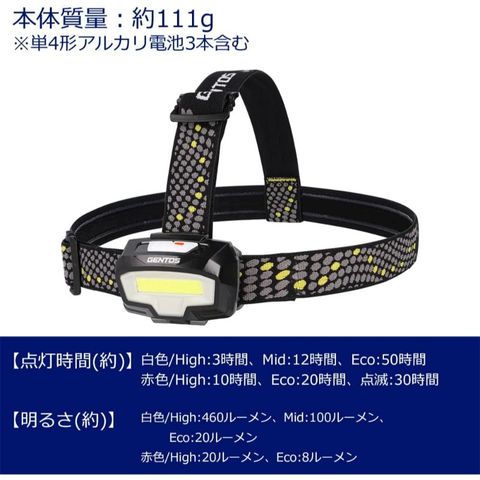 点灯時間(約):【白色】3時間(Highモード)/ 12時間(Midモード)/ 50時間(Ecoモード)、【赤色】10時間(Highモード)/ 20時間(Ecoモード)/ 30時間(点滅)