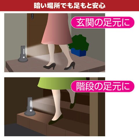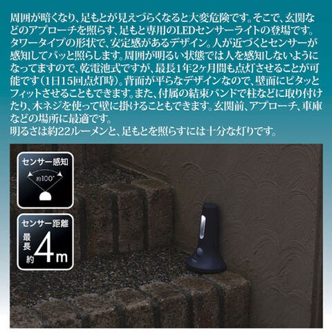 周囲が暗くなり、足もとが見えづらくなると大変危険です。玄関などのアプローチを照らす、足もと専用のLEDセンサーライトの登場です。タワータイプの形状で、安定感があるデザイン。人が近づくとセンサーが感知してパッと照らします。周囲が明るい状態では人を感知しないようになってますので、乾電池式ですが、最長1年2ヶ月間も点灯させることが可能です(1日15回点灯時)。背面が平らなデザインなので、壁面にピタッとフィットさせることもできます。また、付属の結束バンドで柱などに取り付けたり、木ネジを使って壁に掛けることもできます。玄関前、アプローチ、車庫などの場所に最適です。明るさは約22ルーメンと、足もとを照らすには十分な灯りです。