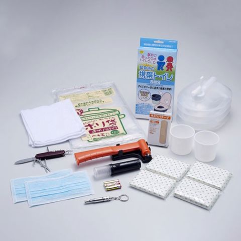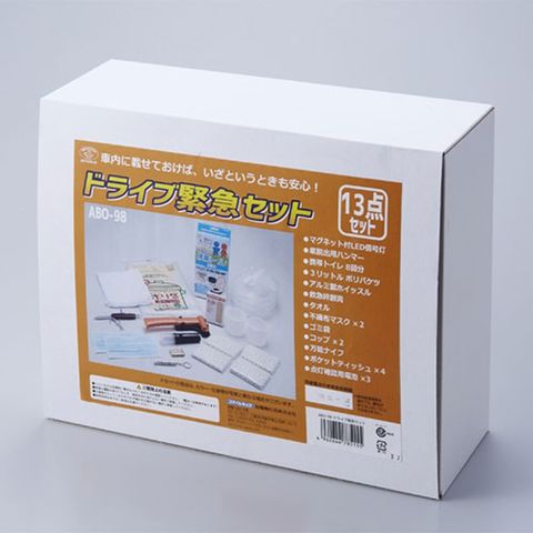 夜間に危険を知らせるマグネット付きLED信号灯や、扉が開かないときに窓から逃げる脱出ハンマー、道路で立ち往生した際に使える携帯トイレなど、これだけ有れば安心な商品が一式揃ったセットです。