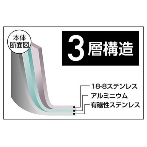 ・鍋の本体は、熱伝導性に優れたアルミニウムを耐久性と保温性に優れたステンレス鋼でサンドした3層構造。