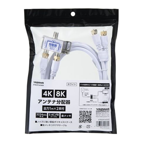 YAZAWA アンテナ分配器 OUT1M×2本 ケーブル付 白 ATB2SP340WH 【同梱不可】[▲][AS]