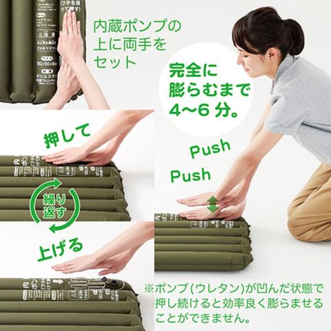 ・製品を開いた状態で排気栓をしっかり締め、内臓ポンプの上ふたを空け、覆うように両手を置き押して上げてをくり返して下さい。約2~3分で完成です。・収納の際は、排気栓を左に回すと空気が抜けます。
