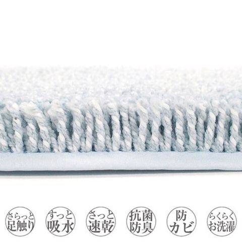 「吸水速乾」のポリエステル糸と「抗菌防臭」のアクリル糸の「2本」の糸をツイストして組み合わせたコシがあり、さらっと感が持続するバスマット。