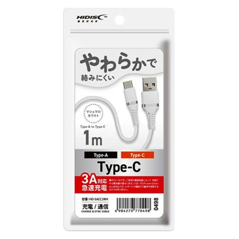 HIDISC やわらかケーブル USB-A to Type-C ホワイト HD-SACC1WH 【同梱不可】[▲][AS]