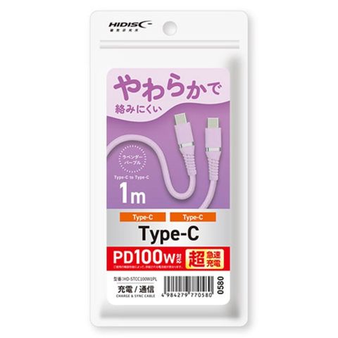 HIDISC やわらかケーブル Type-C to Type-C ラベンダーパープル HD-STCC100W1PL 【同梱不可】[▲][AS]
