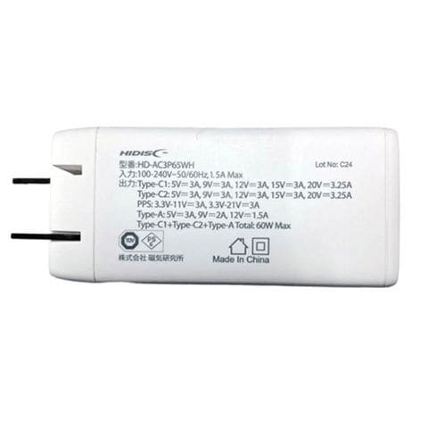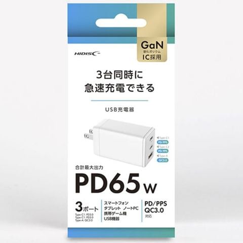 HIDISC USB充電器 PD65W GaN採用 Type-Cx2/Type-Ax1 スイングプラグ採用 ホワイト HD-AC3P65WH 【同梱不可】[▲][AS]