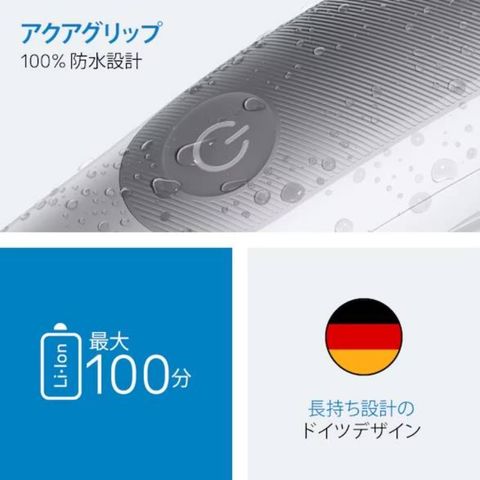 長持ち設計: シャワー中でもコントロールできるアクアグリップを備えた 完全防水仕様。100分間使用できる強力なリチウムイオンバッテリーを搭載。