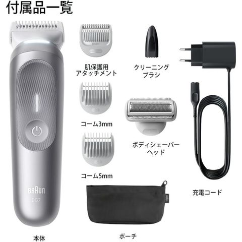 2種のコームとボディシェーバーヘッド、肌保護アタッチメント付き。