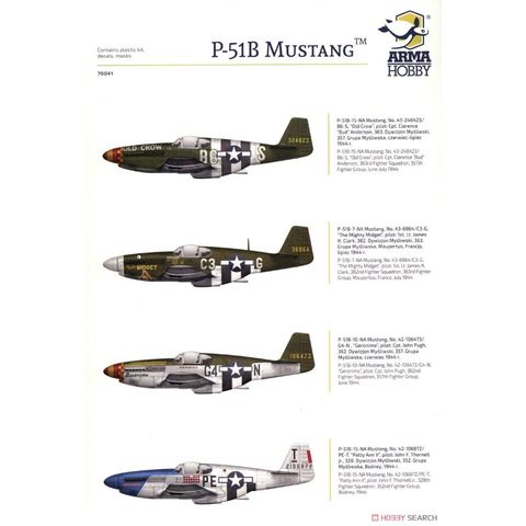 | ADL70041 アルマホビー 1/72 P-51B マスタング 塗装マスクシールと4種類米陸軍航空軍の名機デカールが付属しています。 ・クラレンス・"バド"・アンダーソン大尉の乗機「オールド・クロウ」 ・ジェームス・クラーク中尉の乗機「ザ・マイティ・ミジェット」 ・ジョン・ピュー大尉の乗機「ジェロニモ」 ・ジョン・F・ソーネル・ジュニア大尉の乗機「パティー・アンII」スケール:1/72 |