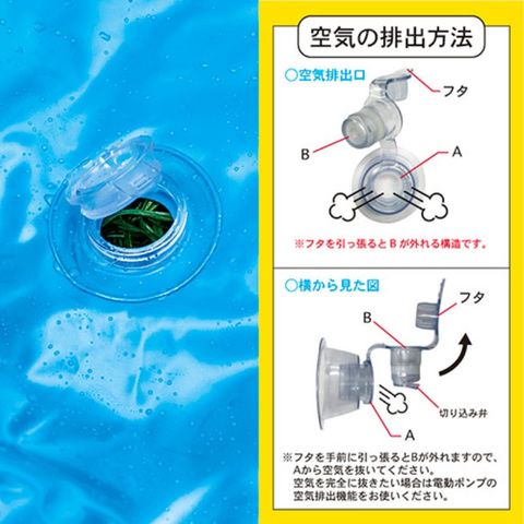 空気の給排気が容易な大型空気栓と水抜き栓が付いたプールです。