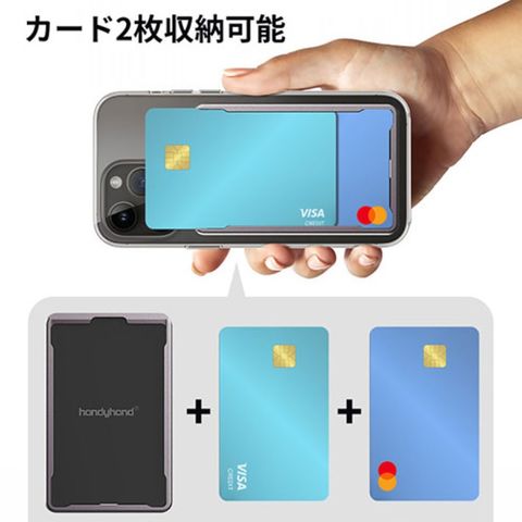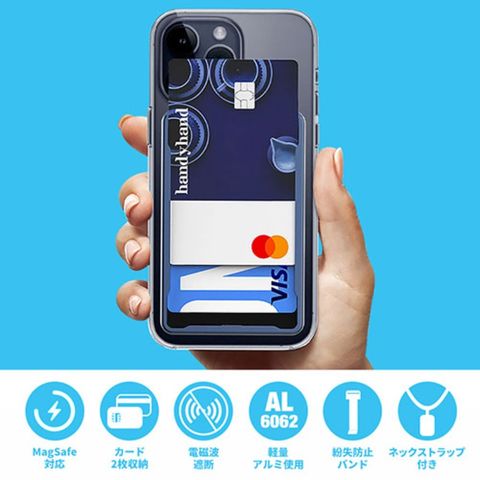 「Handy Pocket MagSafe対応アルミカードケース」は洗練されたミニマルデザインで、機能性を追求したカードケースです。2枚のカードがジャストフィットに収納でき、MagSafe機能でしっかり固定。また、付属のラバーバンドやネックストラップも使って、さらなる利便性をお楽しみいただけます。