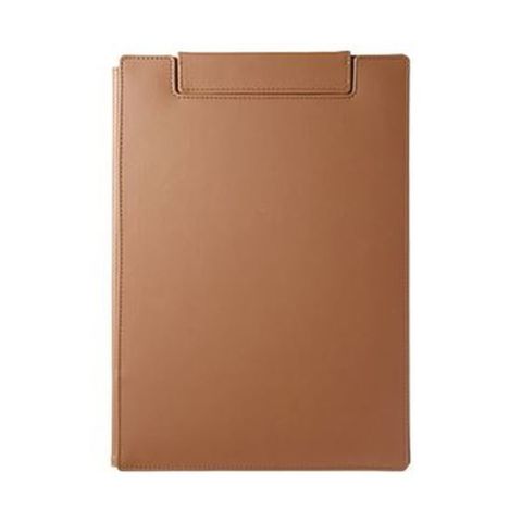 ●カバー付、キャメルのクリップボード。書類や名刺が収容できるポケット付。