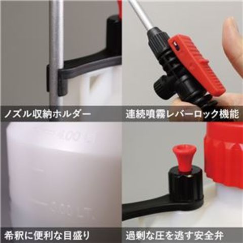 連続噴霧レバーロック機能付き。電源不要の蓄圧式で安心して使用できる安全弁付き。ノズルパイプは軽くて丈夫なグラスファイバーを使用。マシン油剤や石灰硫黄合剤にも使用可能。先端のノズルをまわすことによって霧の拡がり・向きを自由に変えられるので、高い所や広範囲に散布できます。ノズル収納ホルダー付・連続噴霧レバーロック機能・希釈に便利な目盛り付