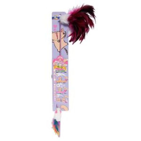 1本でつりざお・スティック・てんびんと3タイプの遊び方。ウサギの毛と鳥の羽根を使用。
