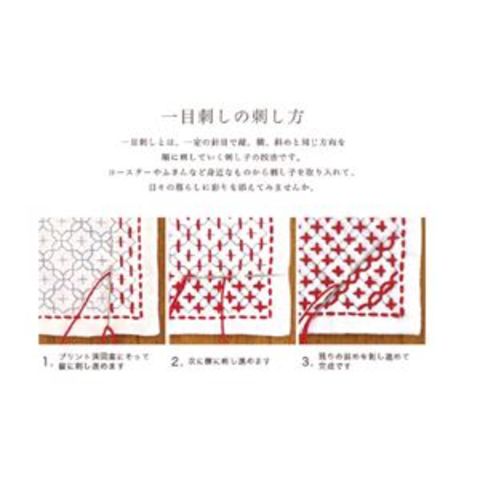 カラフルな糸を使ったポップなデザインを刺し子で楽しめます。図案プリント済で初めての方でも作りやすい。1キットで5枚作れます。一目刺しとは、一定の針目で縦、横、斜めと同じ方向を順に刺していく刺し子の技法です。