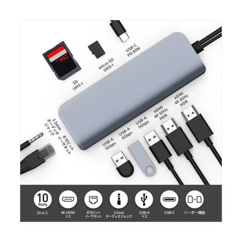 MacBook Pro/Airの2つのUSB-Cポートに接続して4K 60Hz HDMI×2、USB-A 3.1ポート×3、ギガビットイーサネット、MicroSD/SD、60W USB-C 給電ポート(PD)、3.5mmオーディオジャックの10ポートに拡張可能です。