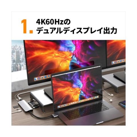 ※デュアルディスプレイに出力するにはUSB-C入力ポート2つの接続が必要です。USB-C入力ポート1つに接続した場合は、1つのディスプレイ出力に対応します。