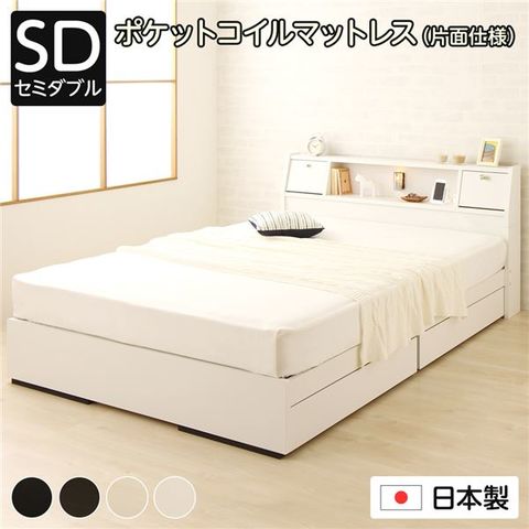 ベッド セミダブル 海外製ポケットコイルマットレス付き 片面仕様 ホワイト 収納付き 棚付き コンセント付き 日本製 木製 AMI アミ 【同梱不可】【代引不可】[▲][TP]