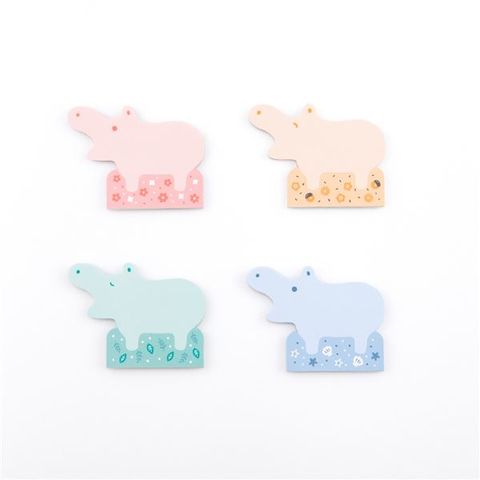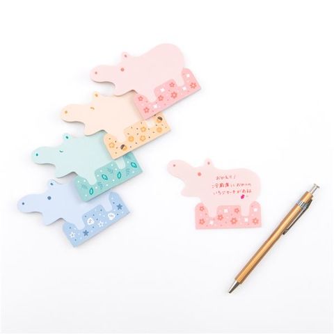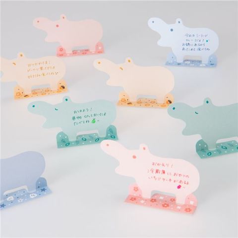 ●ヒポポ(hipopo)シリーズ、スタンドメモ。かばやんの形にダイカットされた色と表情を選べる楽しいメモ。切り込みに沿って折ることで立てられる伝言にぴったりのメモです。