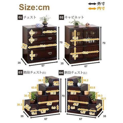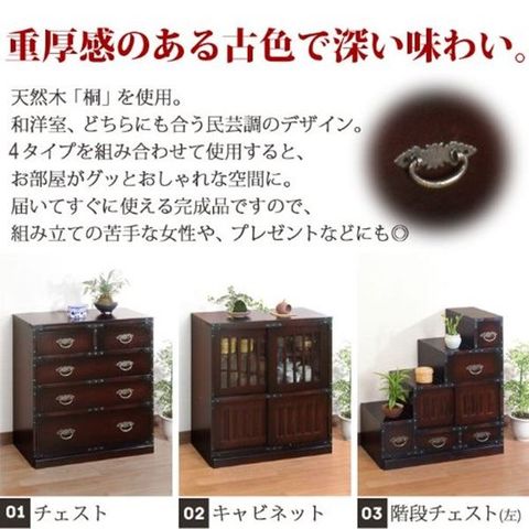 小物や衣類を収納するのに最適なチェストタイプ、茶箪笥や食器棚として使えるキャビネットタイプ、小物を収納しながらディスプレイも楽しめる階段チェストの3タイプよりお選びいただけます。