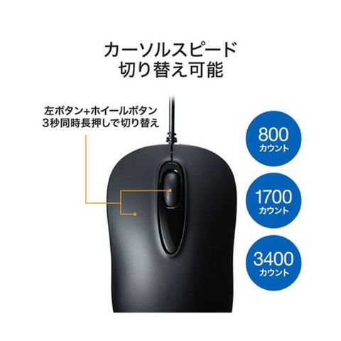 ●用途に合わせてカーソル速度が変更できる、カーソル速度切替機能付きです。800・1700・3400の3段階の切替えができます。切り替えは、左ボタンとホイール(スクロール)ボタンを同時に3秒長押しすることで行えます。