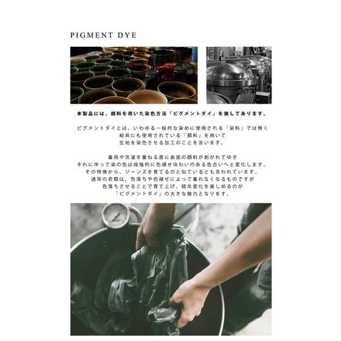 こちらはピグメント加工(ピグメントダイ)と呼ばれる染色方法で染めた後にヴィンテージ加工(ウォッシュ加工)を施しています。繊維の奥まで染み込ませる染料による染色と違い、ピグメント加工では顔料を用いて繊維の表面へ色の粒子を樹脂で纏わせるという方法で染色しています。その為色落ちがしやすく、洗いこむ事で独特のヒビ模様や繊維の露出(白化)など、他にない味わい深いフェード感が生まれます。
