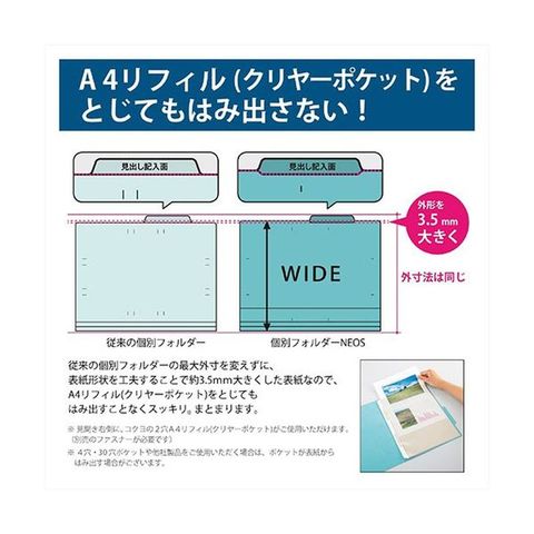 ●外形が約3.5mm大きくなったことで、A4リフィル(クリヤーポケット)をとじてもはみ出しません。穴を開けたくない書類も合わせて管理可能です。