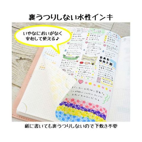 インク色:くろ、あか、あお、みどり、きいろ、だいだい、ちゃいろ、むらさき、うすだいだい、ももいろ、きみどり、そらいろ