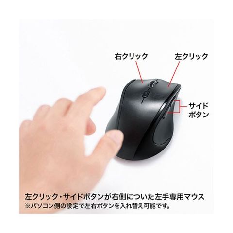 ●マウスの右側面にサイドボタンを搭載した、左利き専用のワイヤレスマウスです。色はブラックです。
