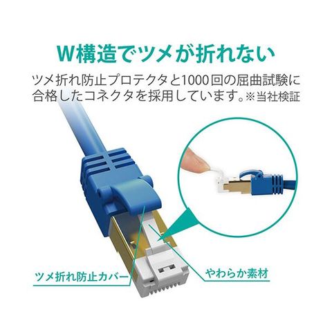 ■ツメ折れ防止プロテクタと屈曲に対する耐久性が高い新素材コネクタを採用したダブル構造で、通常の使用環境では絶対にツメが折れないLANケーブルです。