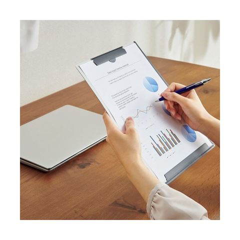 ●テレワークにおすすめ!A4サイズのハードメモホルダー、色はチャコールです。