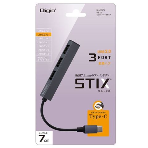 ●Digio2 USB Type-C 極薄変換ハブ STIX USB2.0 Type-A/3ポート グレー UH-C2573GY