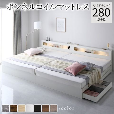 ベッド ワイドキング 280(D+D) ボンネルコイルマットレス付き ホワイト 照明付 収納付 棚付 宮付 コンセント付 【同梱不可】【代引不可】[▲][TP]