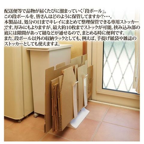 配送便等で品物が届くたびに溜まっていく「段ボール」。この段ボールを、皆さんはどのように保管してますか?本製品は、処分の日までキレイにまとめて整理保管できる専用ストッカーです。厚みにもよりますが、最大約10枚までストックが可能。挟み込み部の底には隙間があって紐などが通せるので、まとめる時に便利です。また、段ボール以外の収納ラックとしても、例えば、手提げ紙袋や雑誌のストッカーとしても使えますよ。
