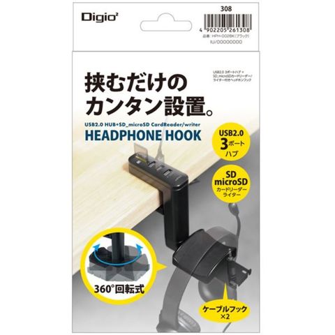 Digio2 USB 3ポートハブ+カードリーダー付 ヘッドフォンフック HPH-002BK 【同梱不可】【代引不可】[▲][TP]