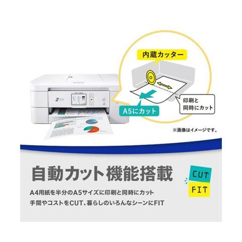 ●自動カット機能搭載プリンター。内部に内蔵されたカッターで、印刷と同時に紙を半分にカット。いつものA4用紙をセットしておくだけで、半分サイズのA5用紙にカットして印刷。