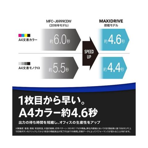 ●1枚目の印刷時間がカラー約4.6秒、モノクロ約4.4秒と大幅に高速化。出力の待ち時間を短縮し、オフィスの生産性アップに貢献します。