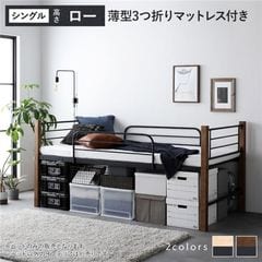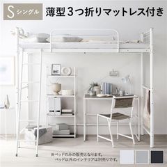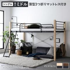 ロフトベッド 〔 シングル ハイタイプ 薄型3つ折りポケットコイルマットレス付き ブラウン×ブラック 〕 スチール 頑丈 【同梱不可】【代引不可】[▲][TP]