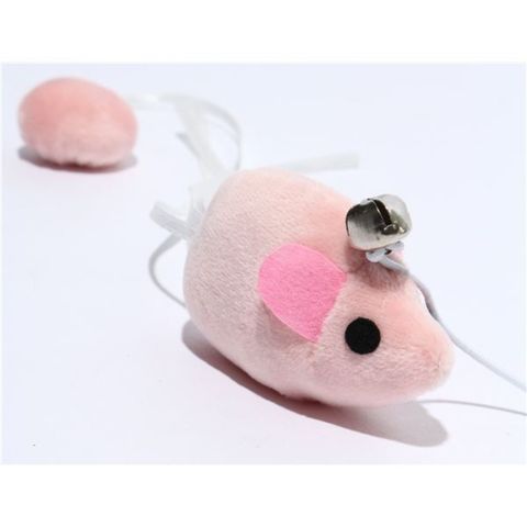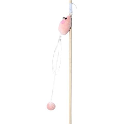 淡い色のネズミ型おもちゃがゴム紐で繋った猫じゃらしです。持ち手部分(ロッド)は木でできており、ナチュラルな雰囲気のおもちゃになっています。ネズミの顔の近くには鈴、細いリボンで作られた尻尾には布ボールがそれぞれ一つ付いていて、動きでも音でも猫ちゃんを引きつけることができます。